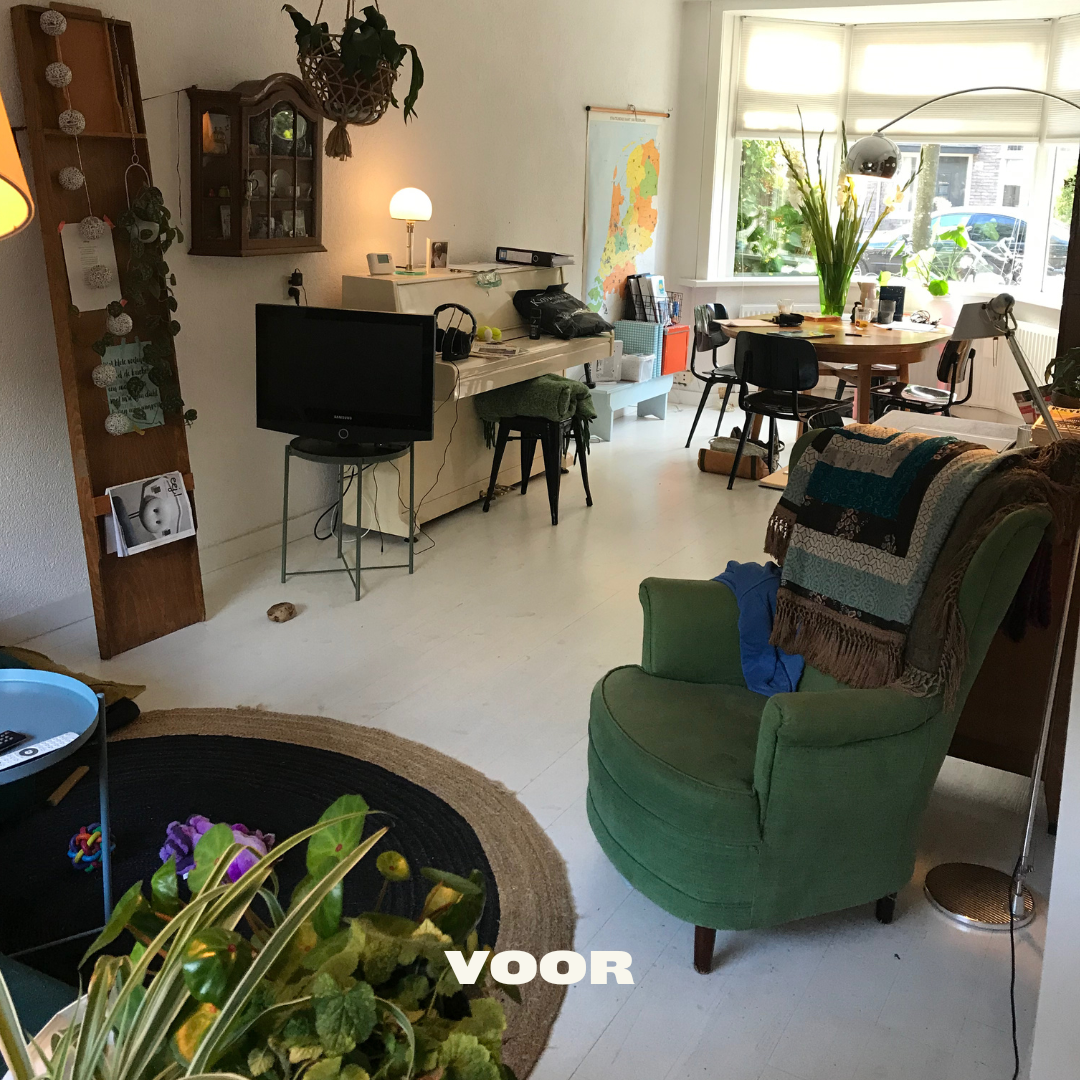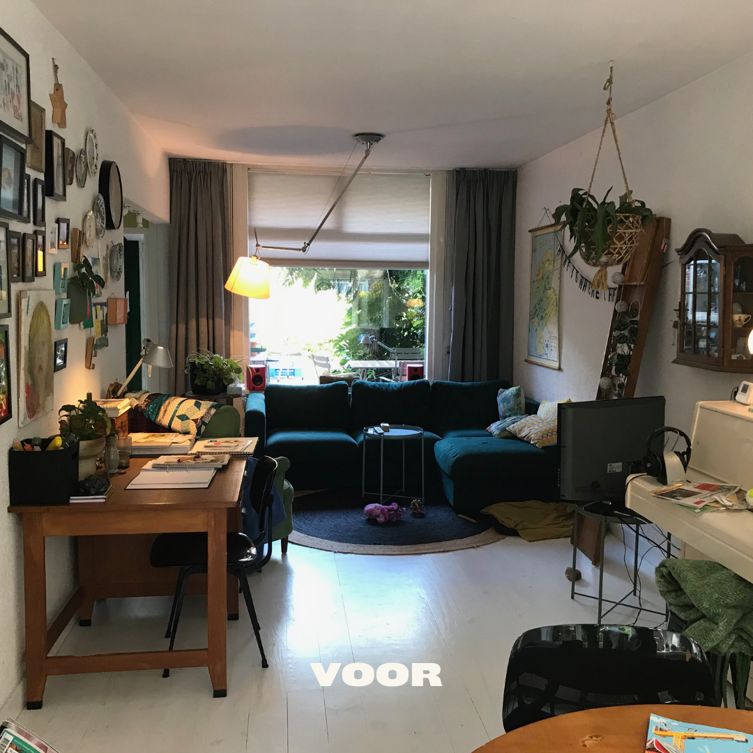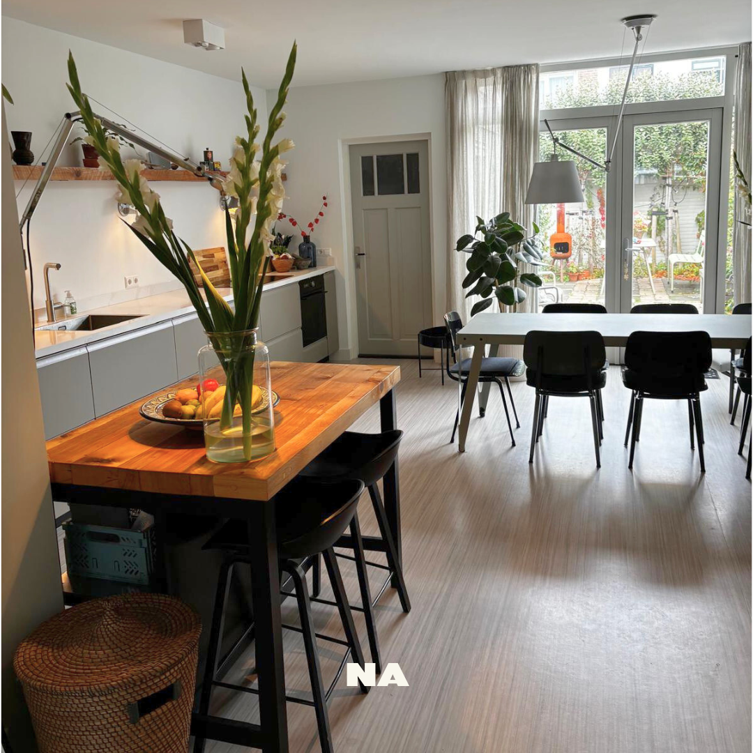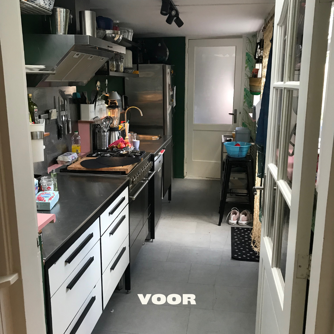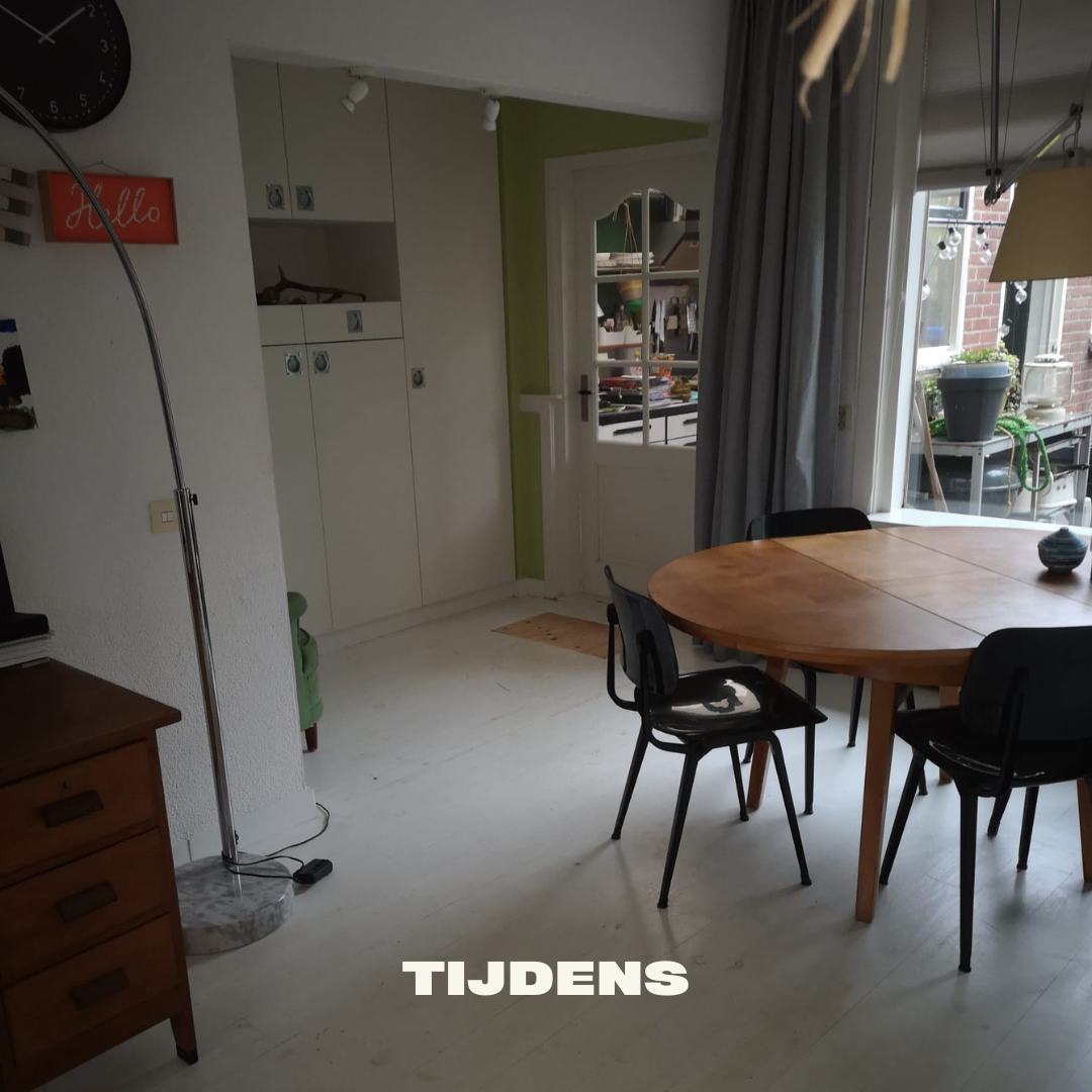 Na de wandeling is Evelien meteen aan de slag gegaan thuis. Ze heeft heel veel opgeruimd en met de opstelling geschoven. Dit voelde al als zo’n enorm verschil en gaf haar meteen al ruimte en rust. Wat ook goed te zien is op de ’tijdens’ foto’s. Vanwege budget hebben we een aantal aanpassingen moeten doen aan het ontwerp voor o.a. de uitbouw. En toch is de keuken het centrale punt in huis geworden. Heeft ze haar eigen plekje om de dag te starten. Kan ze samenkomen met haar zoon en vrienden in de grote woonkeuken. Het is ook veel makkelijker geworden om het huis opgeruimd te houden. Delen van de oude bouwkundige vloer zijn verwerkt tot bar en plank in de keuken. Evelien pakt nog steeds het moodboard en de kleuren erbij als ze iets voor in huis gaat aanschaffen.