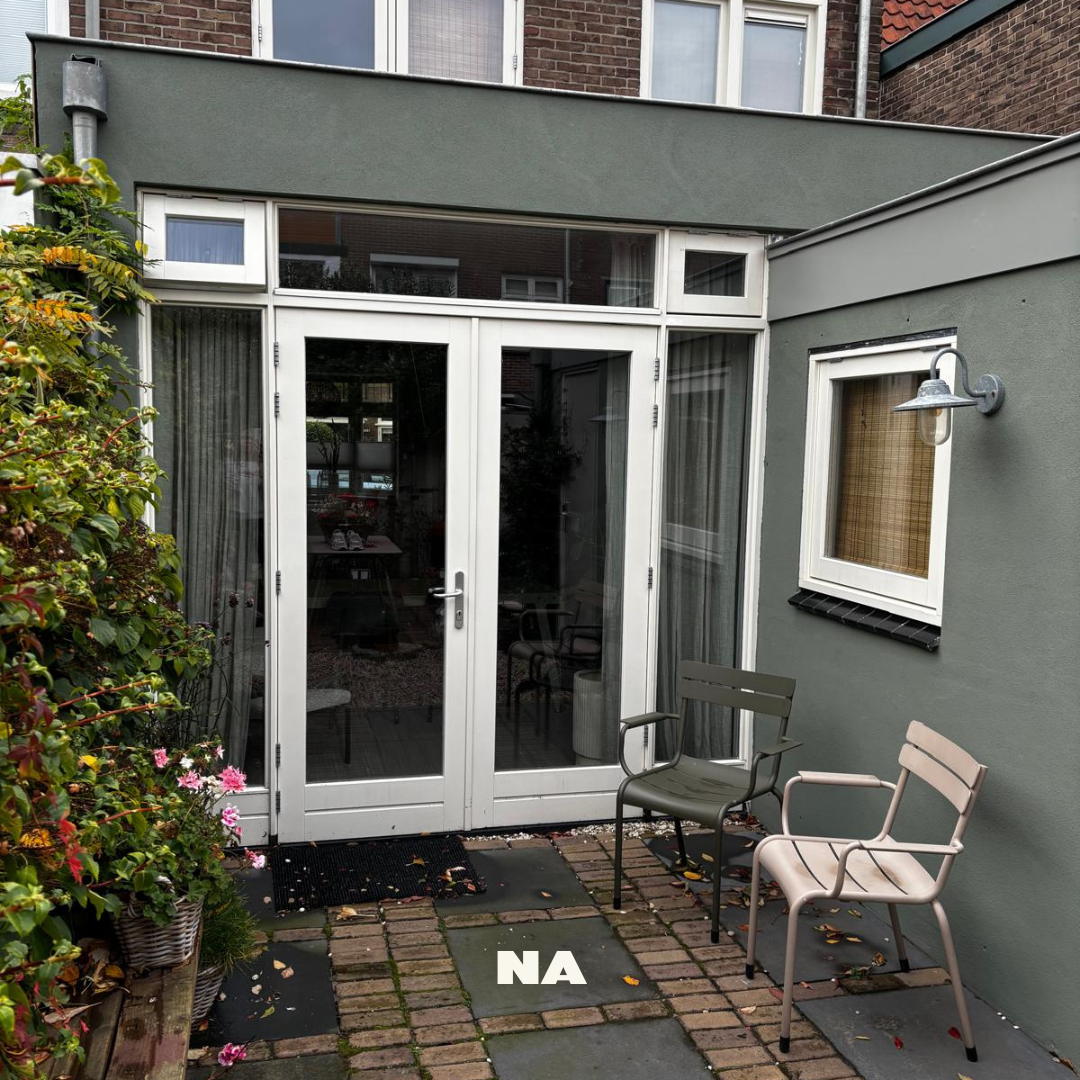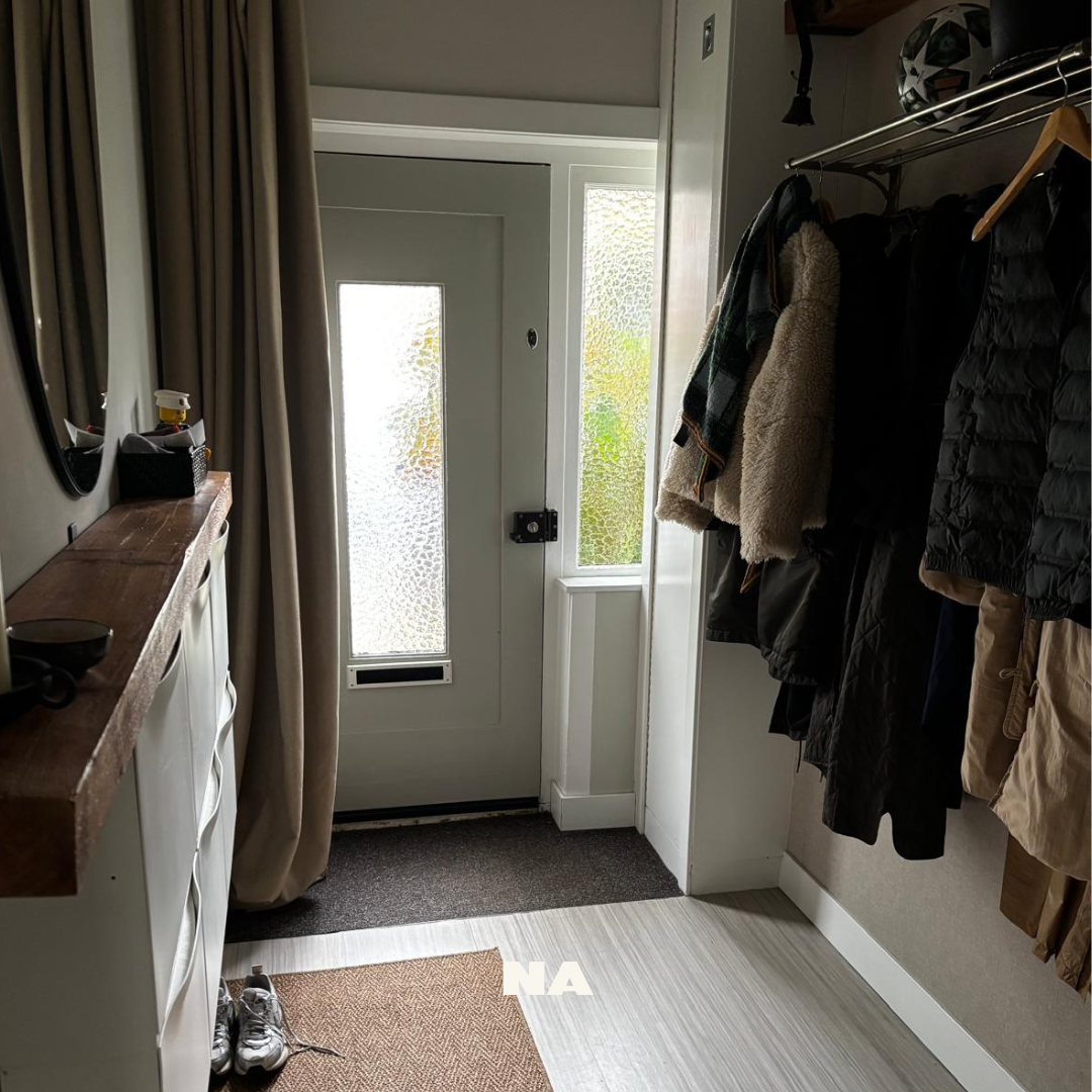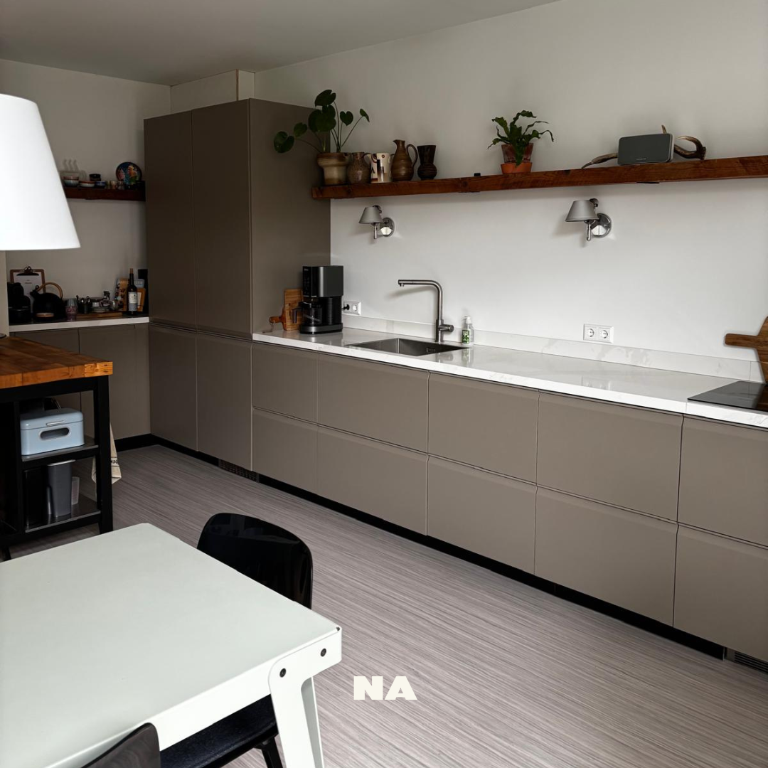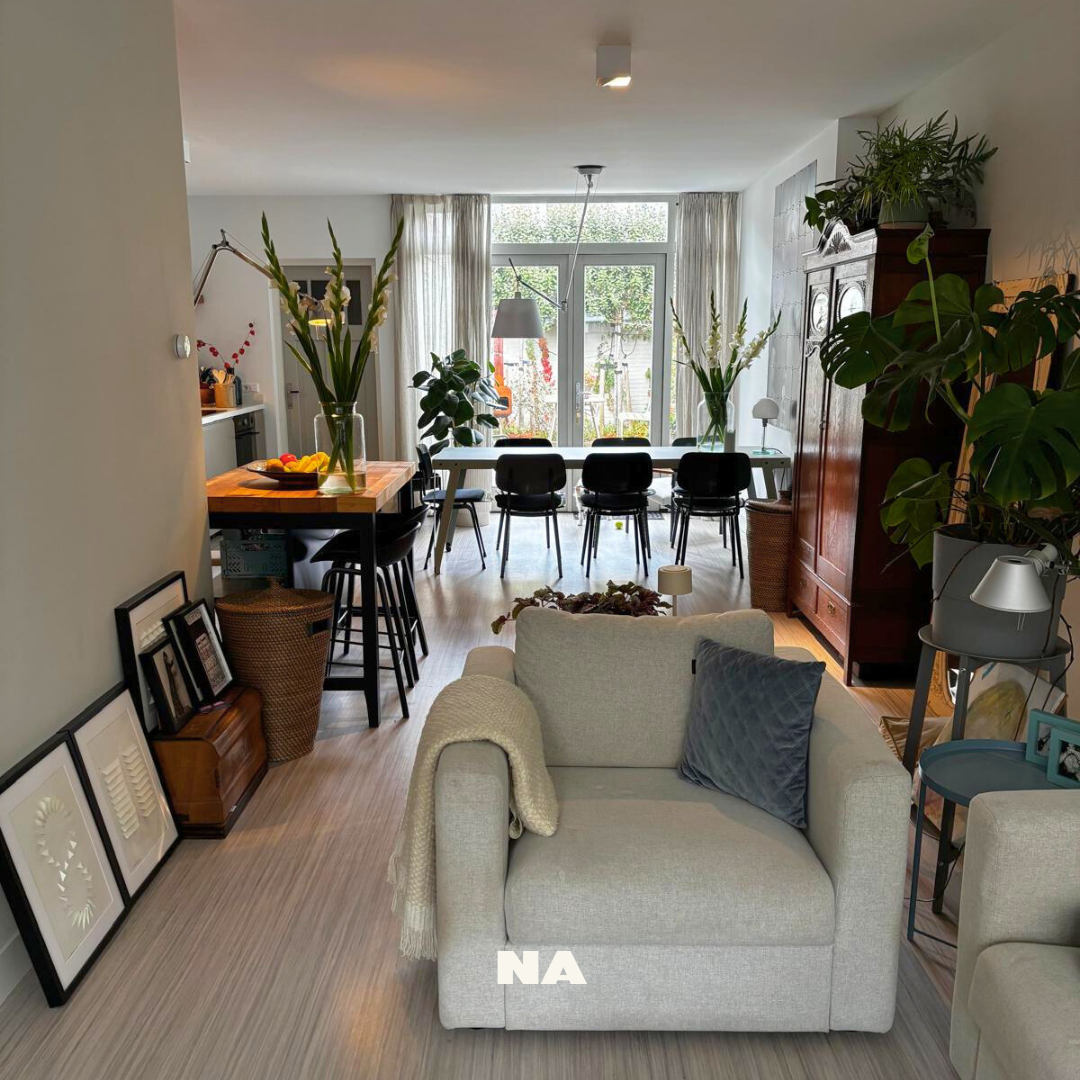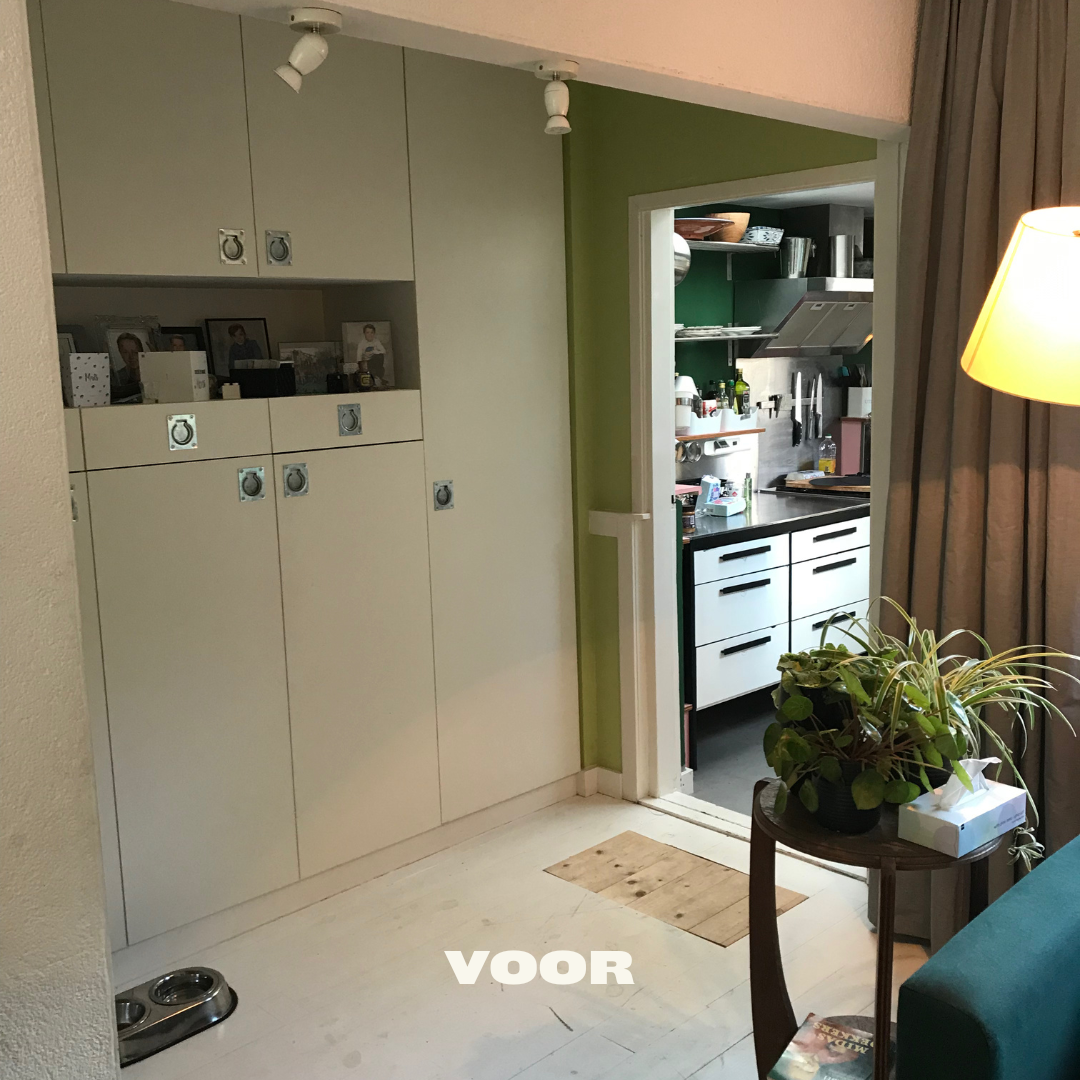 Na de wandeling is Evelien meteen aan de slag gegaan thuis. Ze heeft heel veel opgeruimd en met de opstelling geschoven. Dit voelde al als zo’n enorm verschil en gaf haar meteen al ruimte en rust. Wat ook goed te zien is op de ’tijdens’ foto’s. Vanwege budget hebben we een aantal aanpassingen moeten doen aan het ontwerp voor o.a. de uitbouw. En toch is de keuken het centrale punt in huis geworden. Heeft ze haar eigen plekje om de dag te starten. Kan ze samenkomen met haar zoon en vrienden in de grote woonkeuken. Het is ook veel makkelijker geworden om het huis opgeruimd te houden. Delen van de oude bouwkundige vloer zijn verwerkt tot bar en plank in de keuken. Evelien pakt nog steeds het moodboard en de kleuren erbij als ze iets voor in huis gaat aanschaffen.